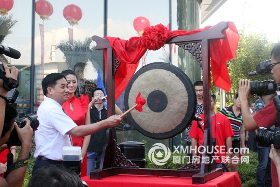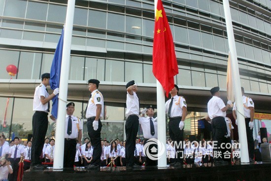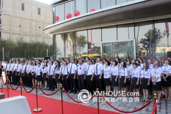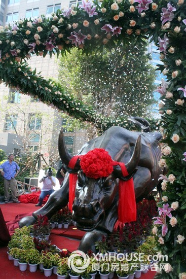 正式仪式开始前,全场来宾配合进行了一场隆重而庄严的升旗仪式。五星红旗、DG真人集团和财产中心的旗帜冉冉升起,预示着“厦门财产中心”这一崭新而富有生机 的海西明珠已在鹭江道百年商圈灼灼闪耀。紧接着,厦门市领导徐模、陈昭扬、叶重耕、翁云雷与DG真人集团柯希平董事长为财产中心祥瑞物“财产金牛”揭彩,在一 阵连续欢悦的开锣声中揭开了金牛的神秘面纱,也正式拉开了落成庆典的序幕。