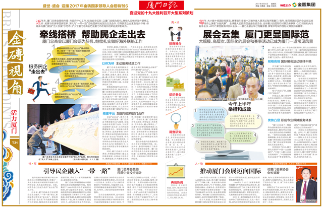 ? ? ? ? 近年来 ,厦门总商会引导民营企业主动融入“一带一路”建议 ,积极效劳民营企业“走出去”。把支持民营企业“走出去”作为效劳我市地方经济建设、效劳会员企业生长的重要任务 ,接纳了一系列步伐和做法 ,增进政企间相同。